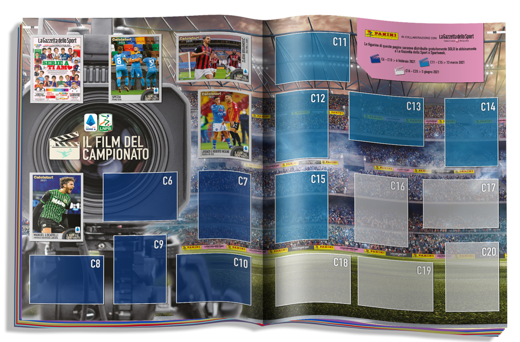 Nella collezione “Calciatori 2021” è poi confermata la sezione Film del Campionato che, con la collaborazione de “La Gazzetta dello Sport”, racconta i principali eventi relativi alla stagione. All’interno delle bustine sono già inserite le prime 5 figurine con momenti e protagonisti importanti, mentre altre 15 figurine verranno distribuite gratuitamente in edicola in abbinata a “La Gazzetta dello Sport” e “SportWeek”, insieme alle 9 figurine della sezione MVP (uscite: 6 febbraio, 13 marzo, 5 giugno).