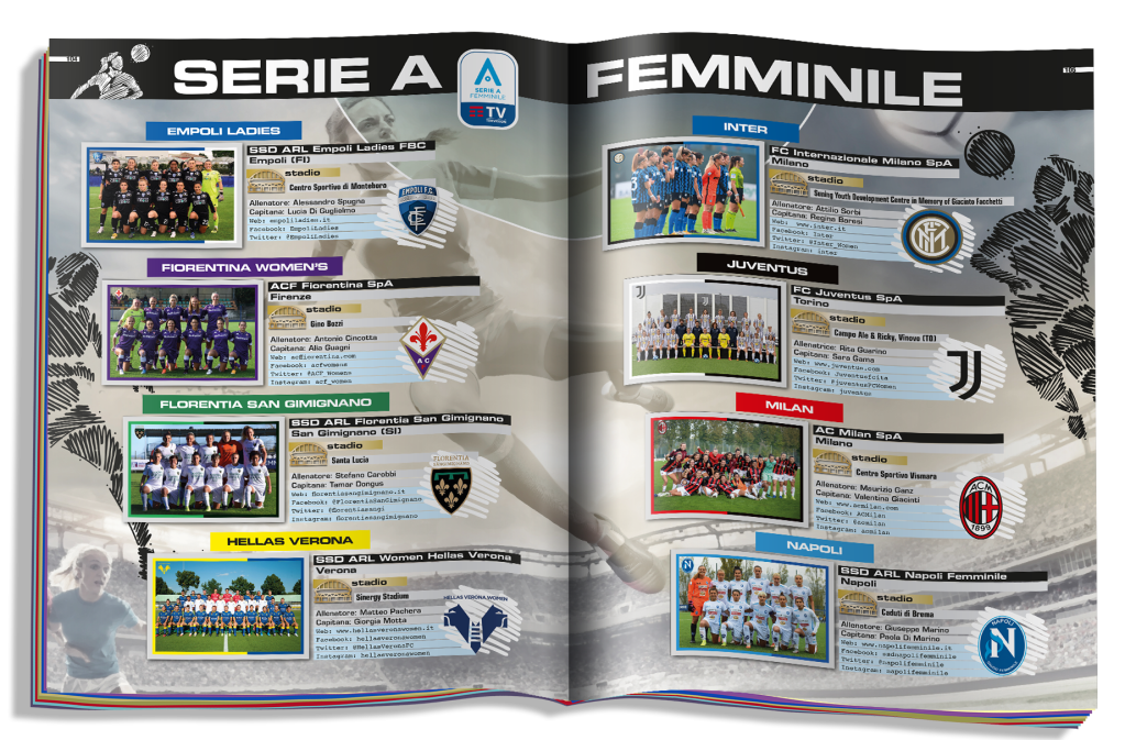 Tantissime le sezioni speciali della collezione “Calciatori 2021”. Tre pagine sono dedicate alla Serie A Femminile, con le figurine delle rose delle 12 squadre del torneo, oltre ad una serie di informazioni sulle società e alle immagini degli scudetti (stampate sull’album).