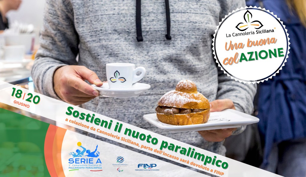 Con il claim “la tua buona colAZIONE” “La Cannoleria” sostiene il primo Campionato Italiano di pallanuoto paralimpica, che si svolge a Roma dal 18 al 20 giugno, devolvendo in questi giorni alla FINP, Federazione Italiana di Nuoto Paralimpico il 15% di ogni scontrino battuto tra le 7,00 e le 11,00 della mattina.