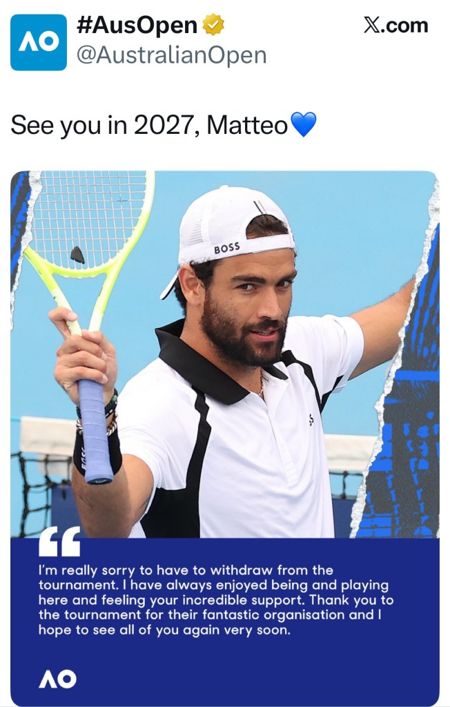 Nella notte italiana tra sabato e domenica prende il via l’Australian Open. Primo Slam stagionale con il nostro Jannik Sinner che difende il titolo. Vi presentiamo una nostra analisi dettagliata del tabellone maschile con antepost e pronostici anche di tutti gli italiani. Purtroppo da segnalare il ritiro di Matteo Berrettini (al suo posto Mackenzie McDonald)